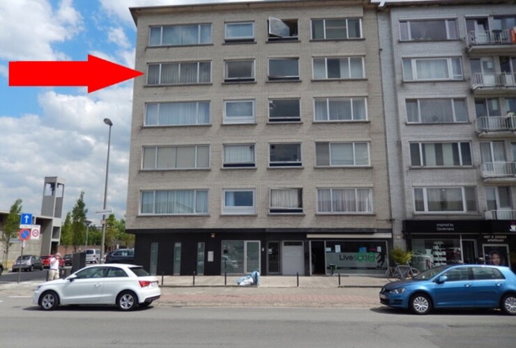 Grondig te renoveren appartement ca. 90 m2 met 2 slpk + individuele garagebox. Indeling, inkomhal op novilon voorzien van dressingkast, ruime woonkamer ca. 35m2 met sierhaard, basic keuken met enkel kasten ca. 7,58m2, ...